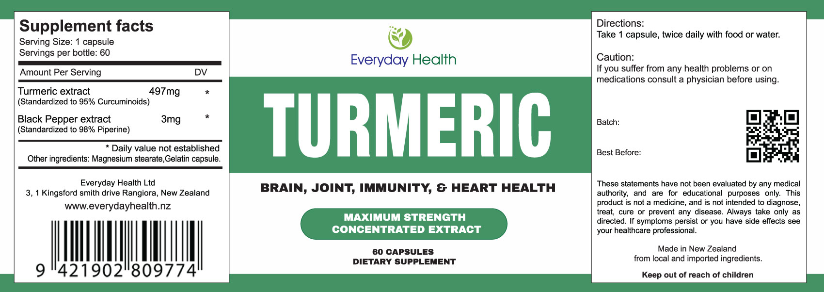 Each gelatin capsule contains concentrated Turmeric extract 500mg, standardized to 95% Curcumin with a dash Black Pepper extract to enable bioavailability.